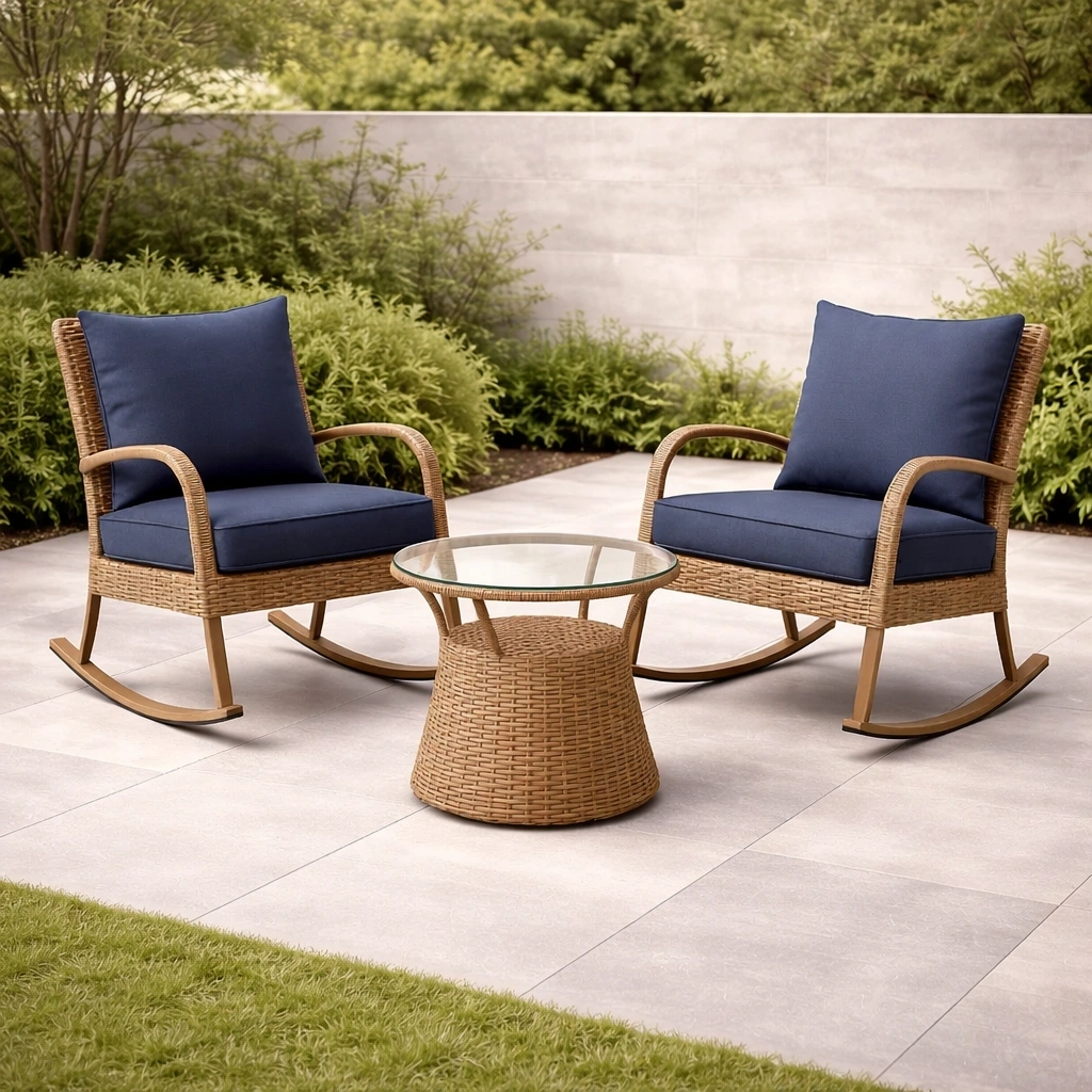 Conjunto de jardín compacto de ratán sintético con cojines azules y mesa de vidrio templado