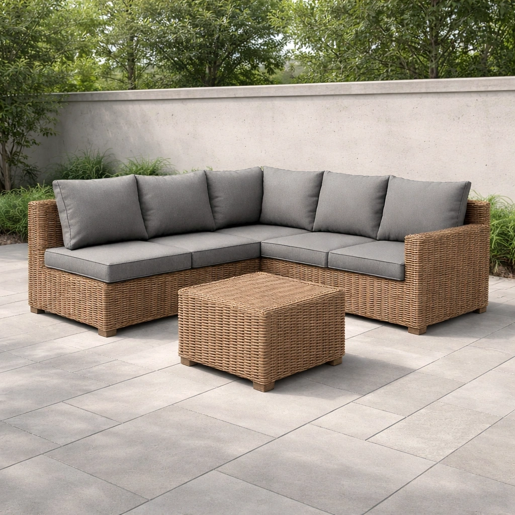 Conjunto de sofá de exterior de mimbre sintético con cojines grises y toldo ajustable